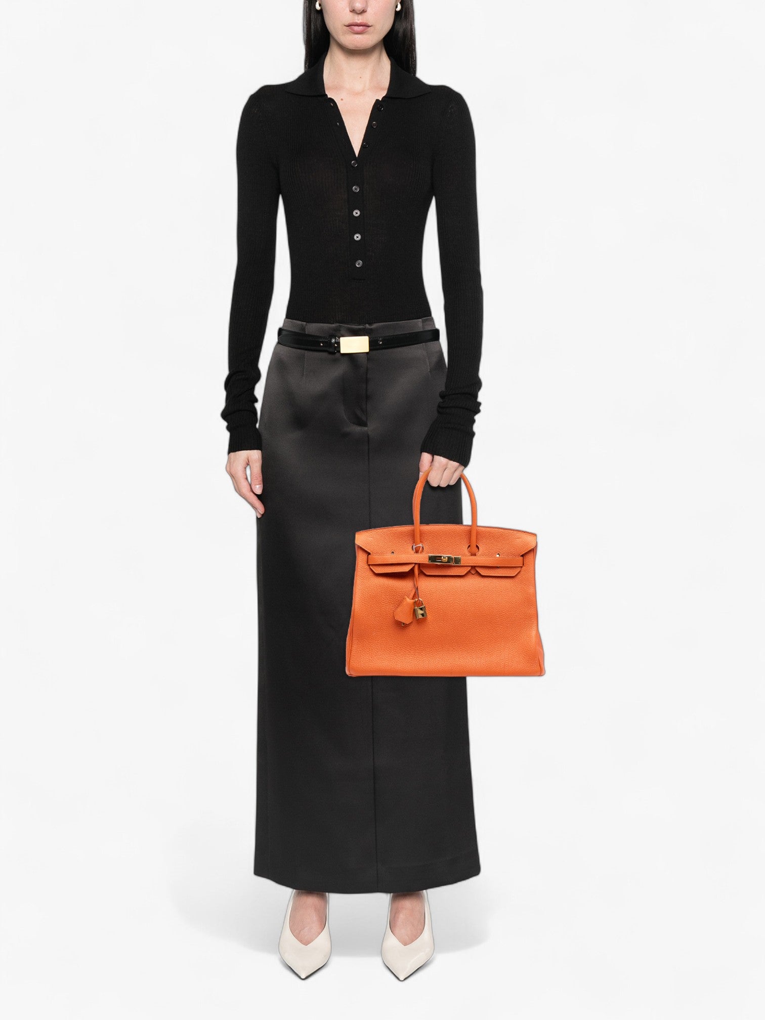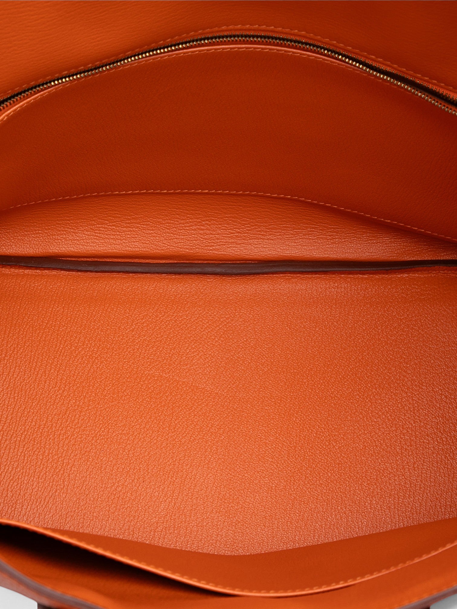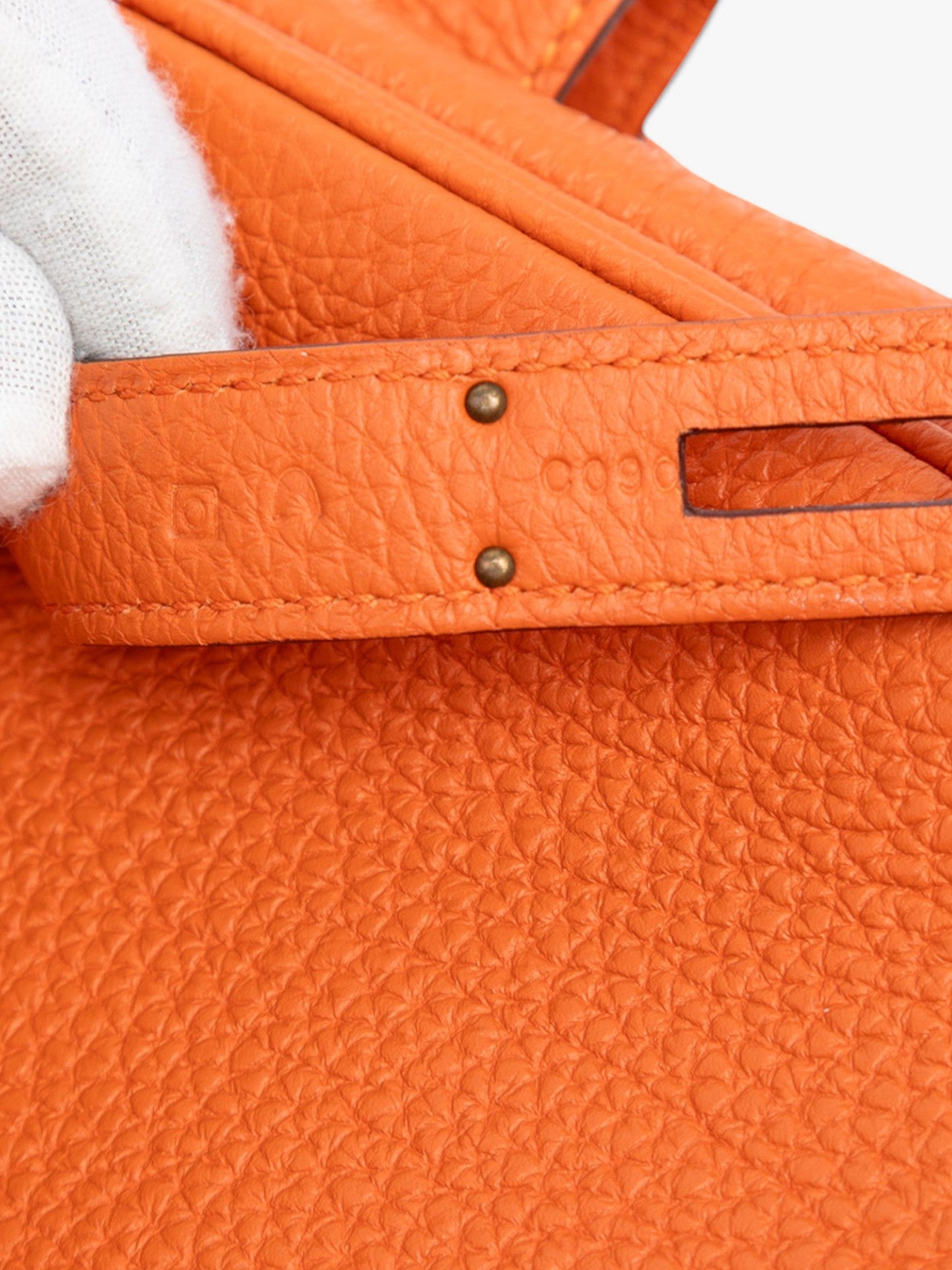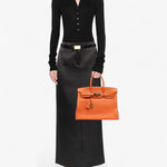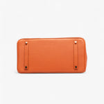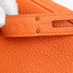 Чантата Hermès Togo Birkin Retourne 35 в оранжево е сияен символ на изтънченост и непреходен стил. Изработена от мека кожа Togo, тя се отличава с леко омекотен силует, навити кожени дръжки и емблематичния преден капак с кожени ленти и turn-lock закопчаване. Просторният интериор разполага с вътрешен джоб с цип и отворен джоб, предлагащ функционалност без компромис с елегантността. Жизнена и в същото време класическа, тази Birkin е изключително впечатляващ модел, който въплъщава непреходното майсторство на Hermès.